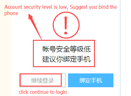 - step 2. then system will show message "Account security level is low, Suggest you bind the phone", click left button continue to login.